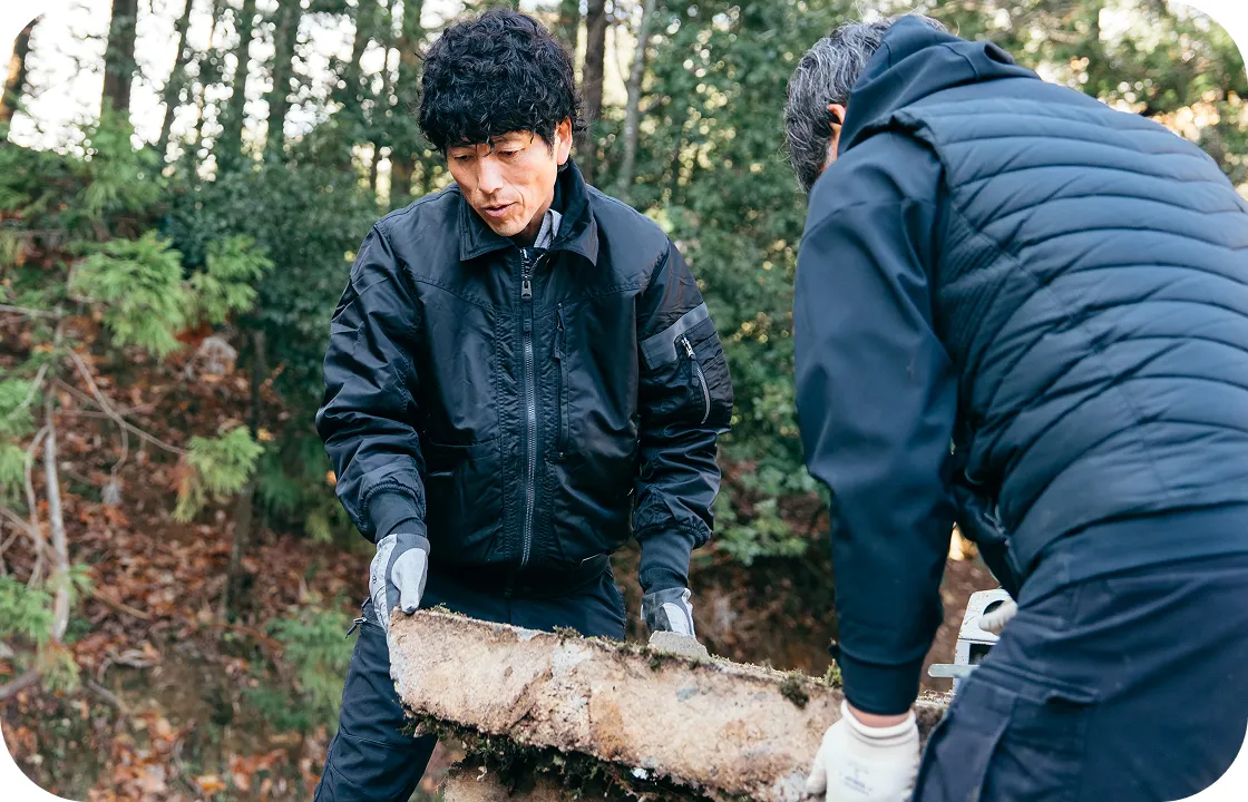 お墓の工事は、一つとして同じ現場がありません。その土地の条件を見極め、経験豊かな職人が安全に、丁寧に仕上げます。狭い山間部や傾斜地などの難しい環境でも、状況に合わせた最適な方法で対応いたします。